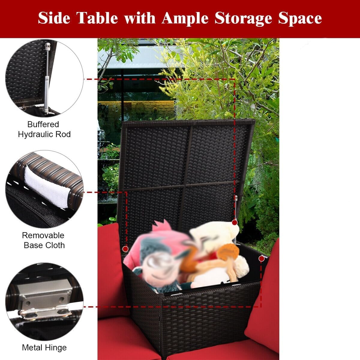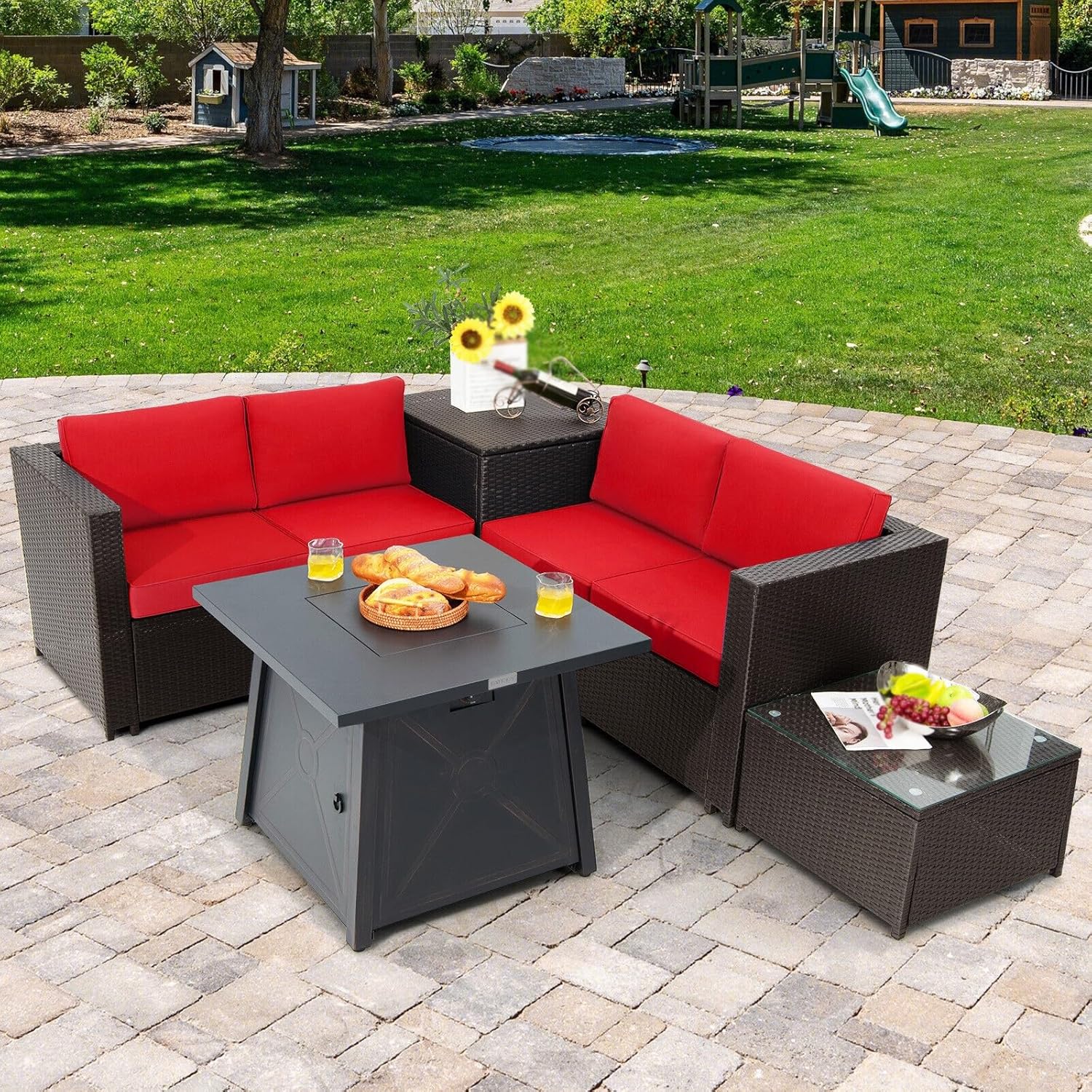Simple ignition system for easy ,Fade-resistant ceramic fire pit tabletop for beautiful additionServe as a fire pit table and extra coffee table thanks to the removable lidProtect the fire table from rain and dust with a waterproof coverSoft padded cushions for comfy sitting experience,Cushion covers are removable for easy cleaningTo prolong the service time, please always keep cushions dry,Storage box with waterproof liner for multiple thingsSelected mix brown PE wicker for sun protection,Strong stability with sturdy and anti-rust steel frame,Safer and sturdier to use with premium tempered glass tabletopTips about the Fire Pit Table: 1) Please do not completely cover the stainless steel burner with lava stones. 2) Please keep lava stones dry to prevent splashes caused by humidity when using. 3) Please wait for the stainless steel burner to cool down and cover it with a waterproof cover.4) Match the standard 20 lbs propane tank (not included).Specifications:Color of PE Rattan: Mix BrownColor of Cushions: RedMaterial: PE Rattan, Steel, Polyester, Sponge, Tempered Glass, CeramicHeat Output: 50,000 BTUSize: as shownPackage Includes:1 x Fire Pit Table1 x Fire Pit PVC Cover1 x Coffee Table1 x Storage Box2 x Loveseats4 x Back Cushions4 x Seat Cushions2 x Instructions(no other presentation items included).Notice:1. Due to manual measurement, please allow 2-3% error, before you bid, please make sure you don't mind.2. The color may vary due to different displays, please refer to the actual product.