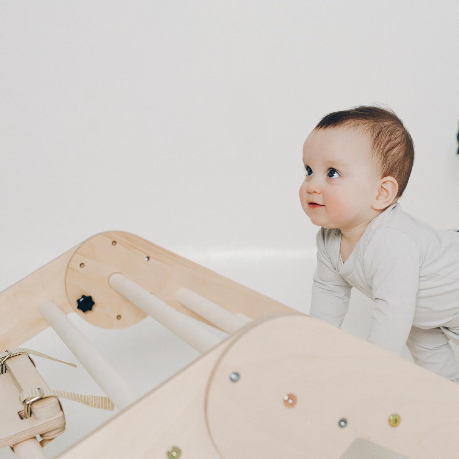 This adaptable Pikler triangle adjusts to lower and higher positions, catering to both babies and energetic toddlers. The accompanying ramp features ladder bars on one side and a slide on the other, forming a comprehensive toddler climbing gym. Named after Dr. Emmi Pikler, a Hungarian pediatrician who advocated for infants and young children to move freely and develop motor skills independently.
