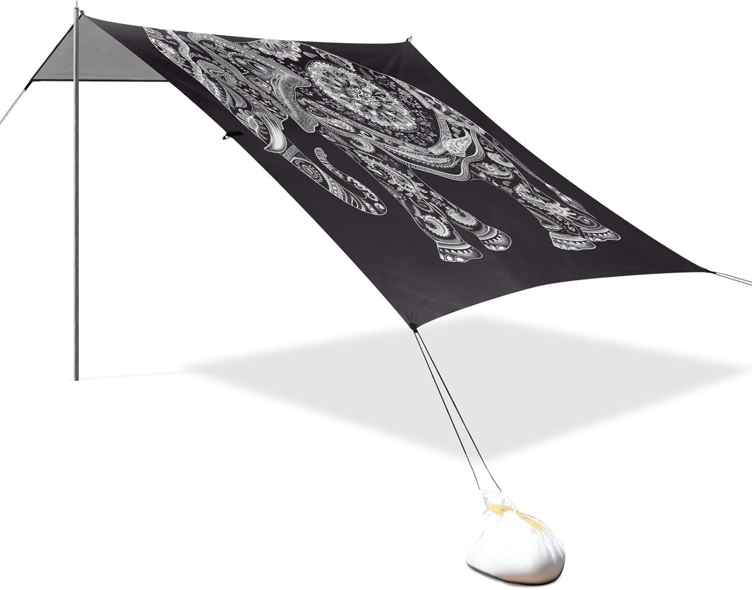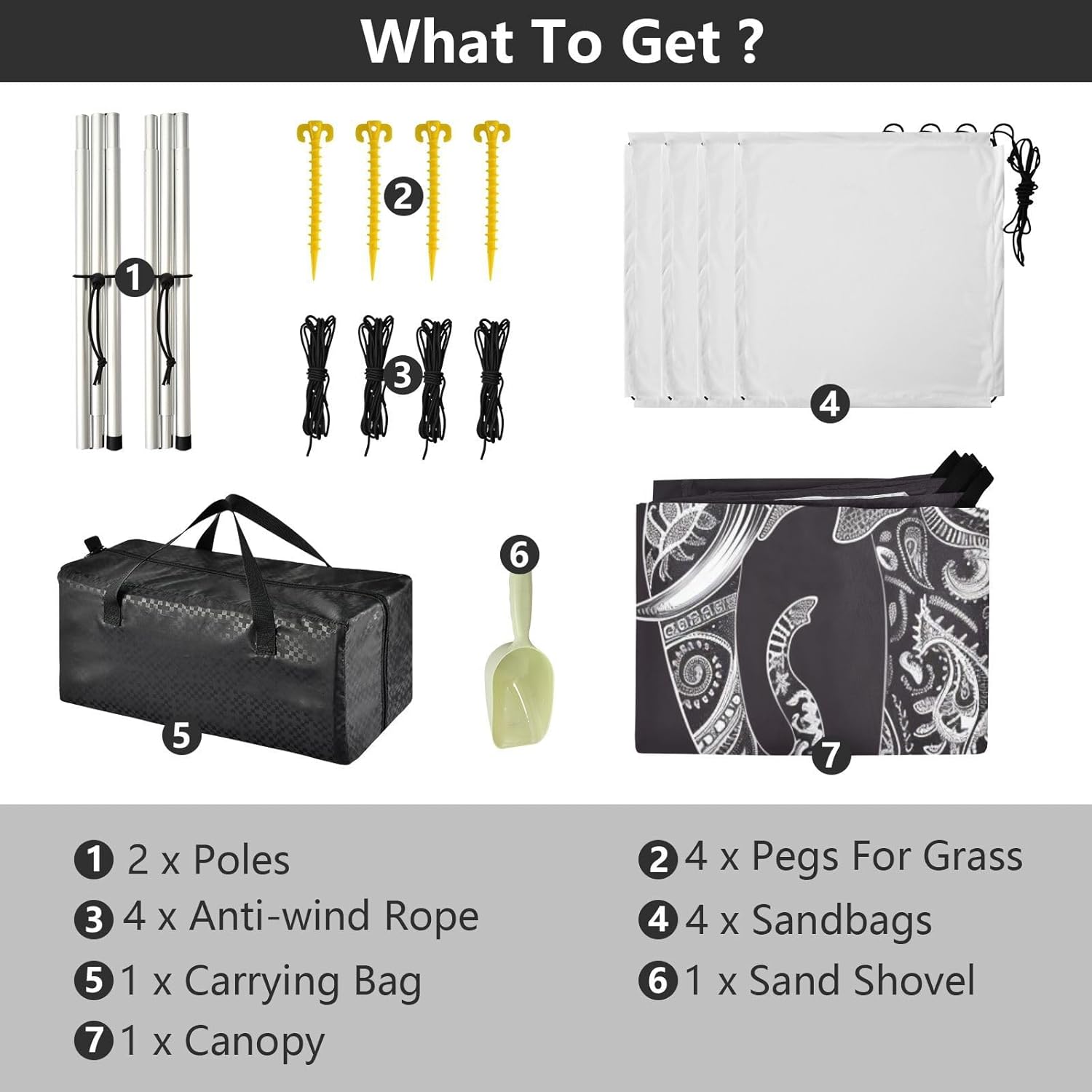 Unpack Cooling trip in 10 minutes! Our 280x320cm beach tent features silver-coated polyester oxford fabric that actively deflects heat while providing UPF 50+ protection-say goodbye to sunburns and squinting! Express your style with eye-catching, tropical-inspired prints that transform ordinary shade into a vibrant oasis. Engineered for stubborn coastal winds, the reinforced frame supports extra guy ropes alongside the included 4 refillable sandbags (use the free shovel!), 4 heavy-duty steel stakes, and 4 reinforced ropes. This high-grade anchoring system laughs at 25mph gusts while you relax. Adventure Beyond Sand: Beach lounging Lakeside camping Park picnics Fishing trips Festival hangouts Backyard "staycations