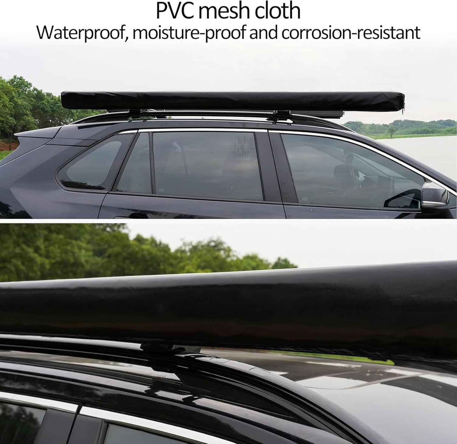 Durable Design Car Awning - Weather-proof vehicle awning for hot days campingOur rooftop tent awning fits on most roof racks and roof rails. Ideal for SUV, MPV, trucks, vans, hatchbacks, trailers, and cars. Excellent-quality FabricHigh-quality waterproof fabric (420D Oxford cloth)PU 5000mm coatingStrong and tear-resistantEasy InstallationBrackets are multi-hole designed that can be adjusted to fit most Roof Racks and Roof Rails.Put up and take down by yourself in under minutes after mounting to roof rack.No complicated operation required, one person can handle it easily. Waterproof PVC bag with zipperZipped cover keeps the canopy from getting sun damaged/wet when not in use.Takes up little storage space when take down.Can assemble with your RTT together.Specification:Color: BlackMaterial: Aluminum Alloy Frame & 420D Oxford ClothWater-proof coating: PU5000 mmProduct Features: Sun protection, waterproof, water repellentUnfolded Overall Dimension: 150*250cm/4.9*8.2ft, 200x250cm/6.6x8.2ft, 200x300cm/6.6x9.8ftAdjustable Height: 3.97.2ft/120220cmTent capacity: 3-8x peopleAluminum Alloy Rod Thickness: 1.2mmSuitable for camping, picnics, car travel and other outdoor activitiesPackage Content1 x Car Side Awning2 x L Shaped Mounting Brackets2 x I-shaped mounting brackets2 x Ropes4 x Set of Bolts4 x Set of Nuts2 x Wrenches1 x Carry Bag