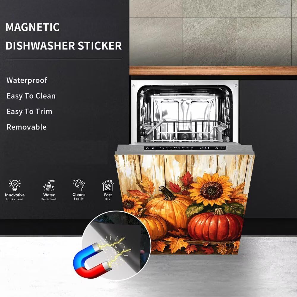 Dishwasher door coverstickers are very suitable for the renovation of kitchens and dishwashers, very suitable for those who like to decorate their homes often. Use our Fall Pumpkin Harvest Dishwasher stickers to decorate your kitchen, Oil and water resistant, can easily handle dirt.Features: heat-resistant, waterproof, oil-proof, dust-proof and easy to clean.Color: Multi.(Please mainly in kind)Material: PVC and PET FilmCategory: Kitchen Dishwasher decor stickers (Ideal for dry, clean, and smooth surfaces ! ! !)Kitchen Dishwasher Covers Size: S - 23 W x 17 H inches; 58.5 W x 43 H cm;L - 23 W x 26 H inches; 58.5 W x 6 H cm;Attention:Before buying, you can measure the size of the dishwasher or washing machine and choose the appropriate size. Sticker is easy to modify, and you can also cut it after receiving the goods.Just ensure that your dishwasher is magnetic before ordering the dishwasher cover magnet
