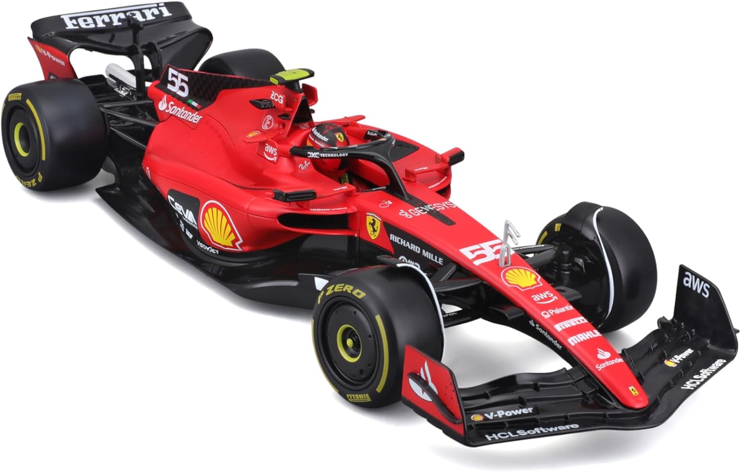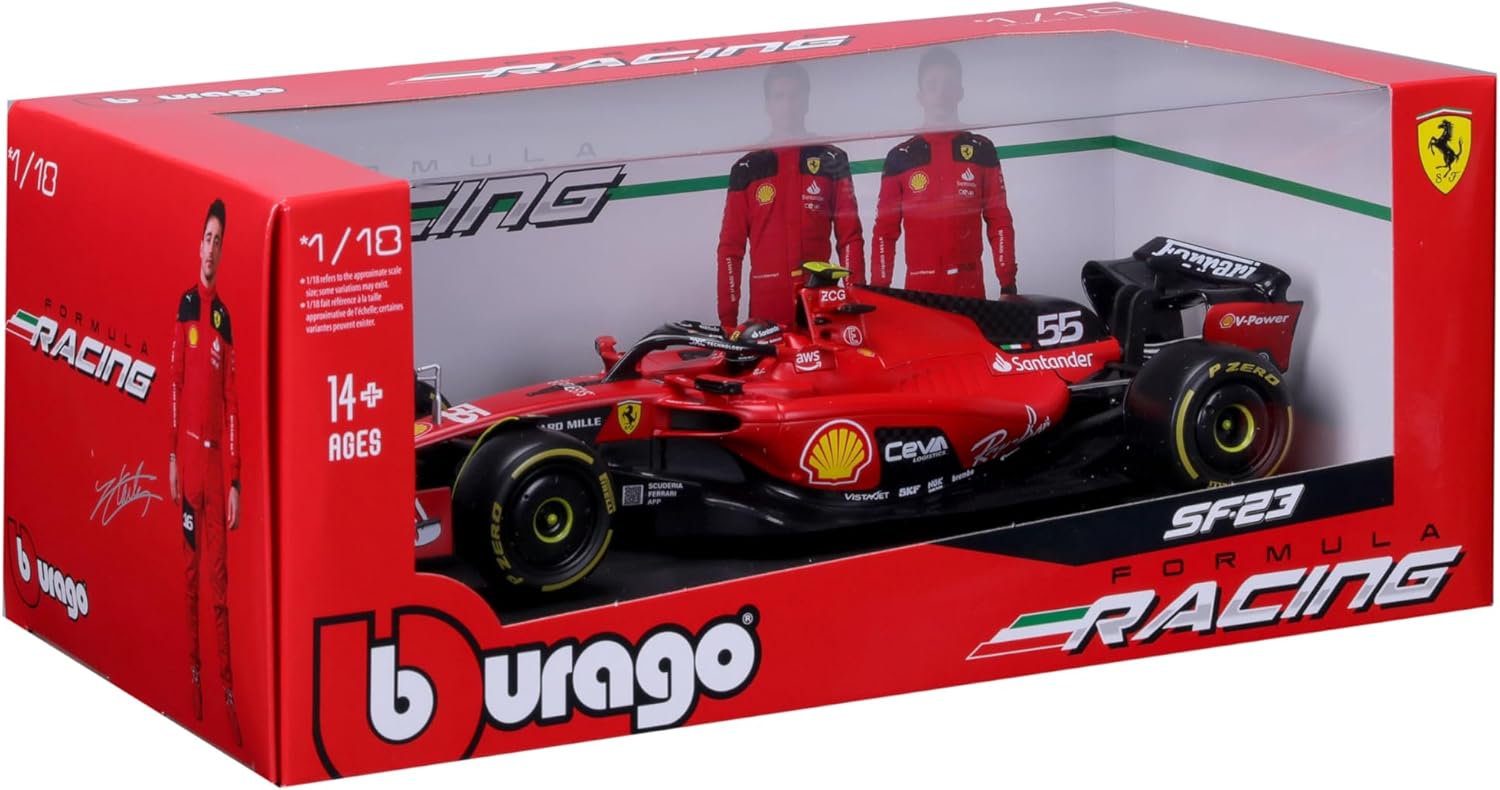 1:18th Ferrari SF-23 Carlos Sainz #55 2023 Produced by Bburago this is a detailed replica of the 2023 Ferrari racecar driven by Carlos Sainz featuring authentic sponsor and team decals, detailed cockpit and driver figure. Comes in window packaging. Size: 10".