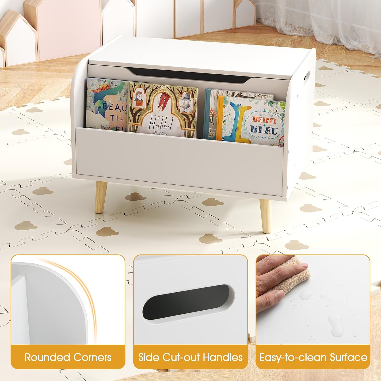Description:Let your child keep a clean play area with our toy box with front bookshelf!Combining a toy chest and a front-facing bookcase, the kids storage organizer helps kids develop good habits of reading and sorting out. The spacious toy box can hold a lot of kid's items. 17" child-friendly height brings convenience. Secure hinge and front cut-out handle make it safe to open the lid for easy access to toys and storybooks. Supported by sturdy wood legs, the toy storage box stands up to daily activity. Furthermore, the rounded corners ensure safe and reliable use. After use, the smooth finish is super easy to wipe clean.Features:Toy box and bookshelf for ample storage spaceIdeal for storing toys, books, blocks, and kids clothes4 pine wood legs for natural texture and great strengthWooden panels for sturdy structure and long-term useSafety hinge and front cut-out handle for secure opening or closingRounded corners for safe touchSide cut-out handles for easy movementEasy-to-clean surface for hassle-free maintenanceAssembly neededSpecifications:Color: Pink/ WhiteMaterial: Pine Wood, MDFProduct Dimensions: 23.5" x 16" x 17"/60 x 40 x 43 cm (L x W x H)Size of Interior Space: 22.5" x 10.5" x 11"/ 57 x 27 x 28 cm(L x W x H)Net Weight: 22 lbs/10 kgPackage Included:1 x Toy Organizer with Bookshelf1 x User Manual