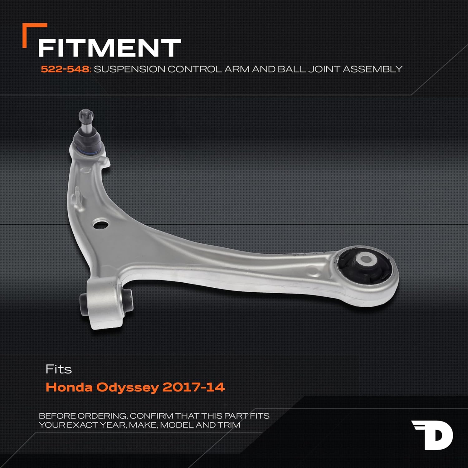 This suspension control arm and ball joint assembly is a direct replacement for the original equipment on specific vehicle applications. An industry-leading evaluation process ensures a smooth ride, directional stability and predictable dynamics. This part is compatible with the following vehicles. Before purchasing, enter your vehicle trim in the garage tool to confirm fitment. [Honda Odyssey: 2014, 2015, 2016, 2017]