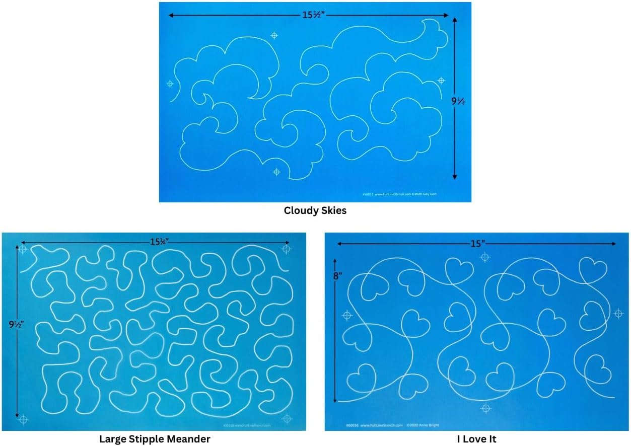 This Full Line Stencil Bundle includes three large Full Line Stencils. They are all easily connectable with simple registration marks to quilt beautiful continuous designs all over your quilt. The registration marks will help you align side to side repeats as well as top to bottom rows. We’ve selected three popular patterns from our top designers. They are all continuous line sewing, to get the job done quickly and easily and of course with beautiful results. Great for all skill levels and all types of quilters! #31019 Stipple Meander, Approx. 9 ¾” x 15 ¼” #50032 Cloudy Skies, Approx. 9” x 15 ¾”, 2019 Judy Lyon #60036 I Love It, Approx. 8 ¼” x 15 ½”, 2019 Anne Bright Full Line Stencils are made of tough nylon mesh fabric; they have no true openings. Instead, the chalk sifts through the open mesh areas eliminating the need for breaks and bridges throughout the design as in the antiquated plastic stencils. A Pounce Pad is necessary to transfer them. There is very little maintenance involved in caring for the stencils, and they could last a lifetime even if neglected. We suggest you wipe the chalk off the stencil before using it with different color chalk; a microfiber towel works well. Full Line Stencils are also water-resistant; it’s possible to use other mediums such as paint or ink with them. They have no right or wrong side, and most have registration marks to align the pattern's repeats. Should your stencil become wrinkled, simply press it flat with an iron (med. High temp, no steam). Pounce Pads are sold separately, and there are hundreds more Full Line Stencils to choose from to expand your collection.