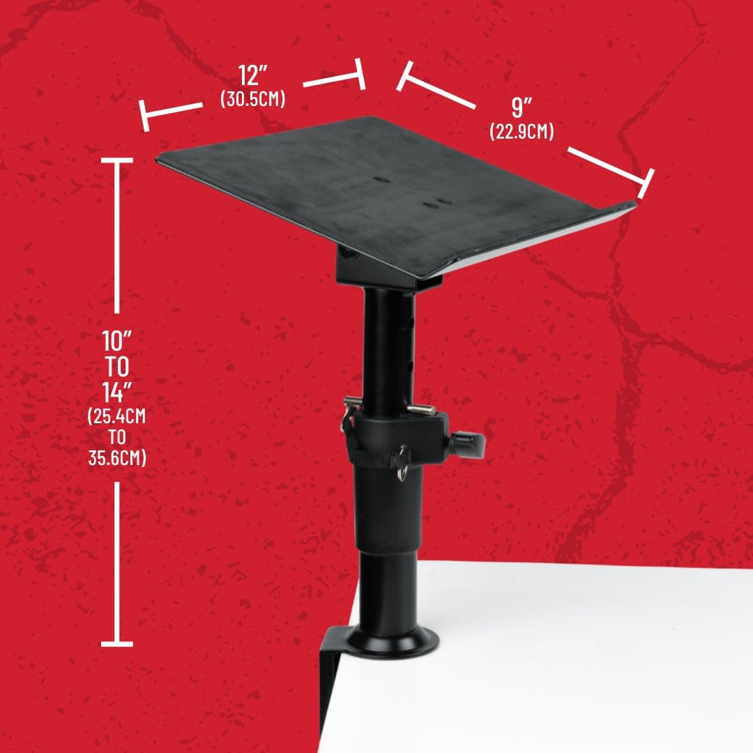 The clamping laptop desktop stand by Gator Frameworks elevates laptop computers from surfaces to reserve valuable space for additional desktop devices and accessories. The GFWLAPTOP2500 suits an array of applications, including audio recording, DJ performance, podcasts, broadcasts, content creation, live streaming, home office solutions, and similar uses. The top platform measures 12”/305mm x 9”/229mm with a soft layer of EVA padding to prevent scratches and to help keep gear from slipping off. The platform also features an ergonomic tilting mechanism underneath with a locking knob to set the tilt angle between 0-15 degrees for easier access to keys and controls. Clamp the stand to any surface edge up to 2.63”/67mm in thickness to get the most out of your workstation area. Adjust and secure the stand height between 10”/254mm and 14”/356mm using the soft-touch knob and built-in safety pin. The GFWLAPTOP2500 will support up to 20 lbs./9.07 maximum in weight.