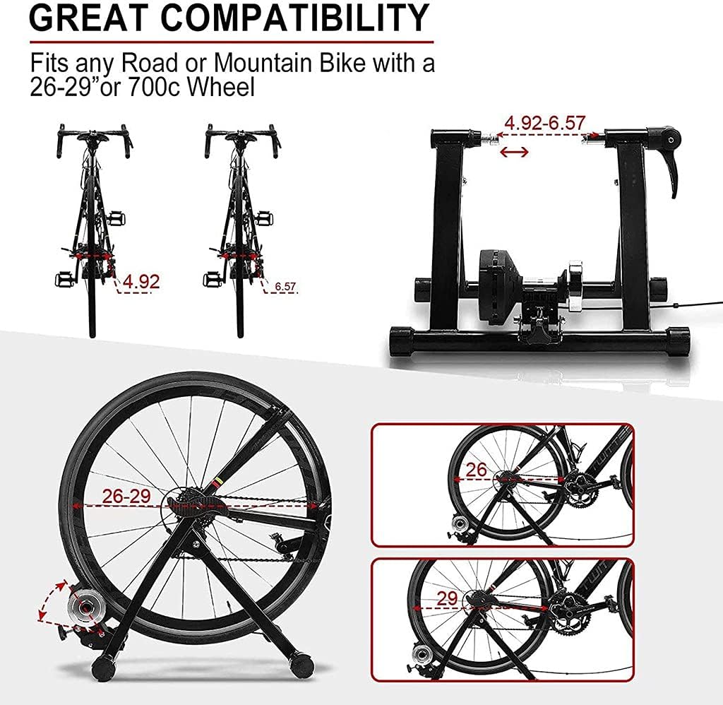 The Noise Reduction's Noise Reduction Stationary Wheelbase works to reduce the amount produced by your spinning rear wheel, much to the relief of your girlfriend the dog and the annoyance of your girlfriend the neighbors. The smoother drag wheel can also extend the life of your bike. Easy to assemble, easy to use Just click the push lever clamp to easily release and remove your ride. The indoor bike trainer stand can be assembled and disassembled in a few minutes. Just lock your bike in place, set your ideal resistance, and start pedaling! Package contents: 1 x indoor bike trainer stand