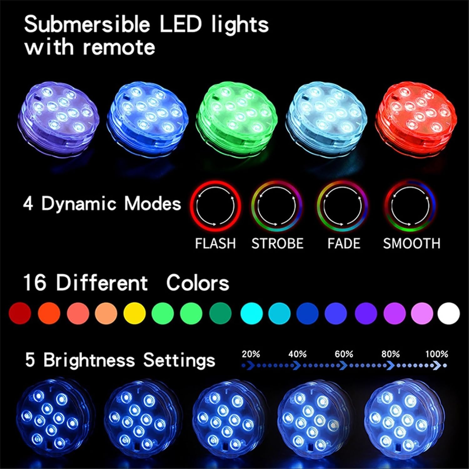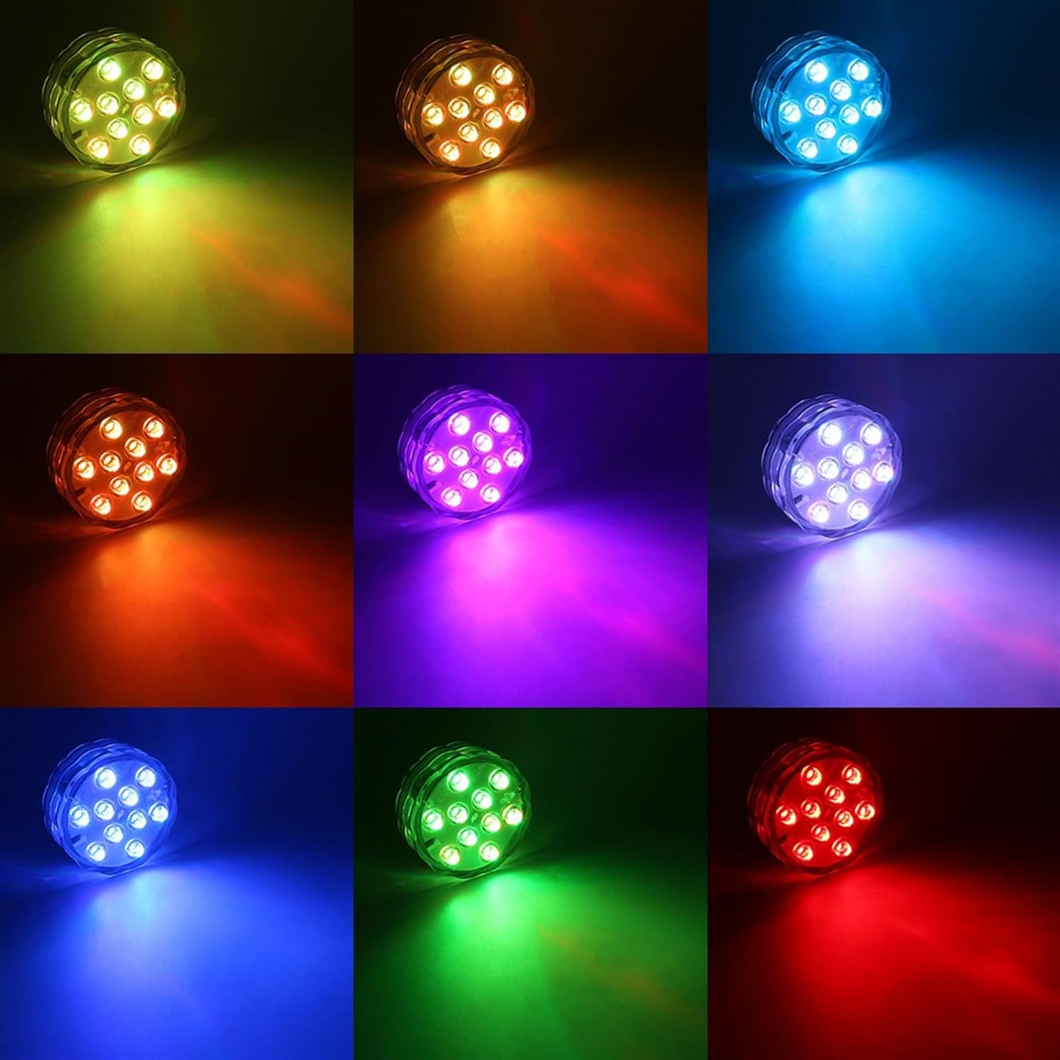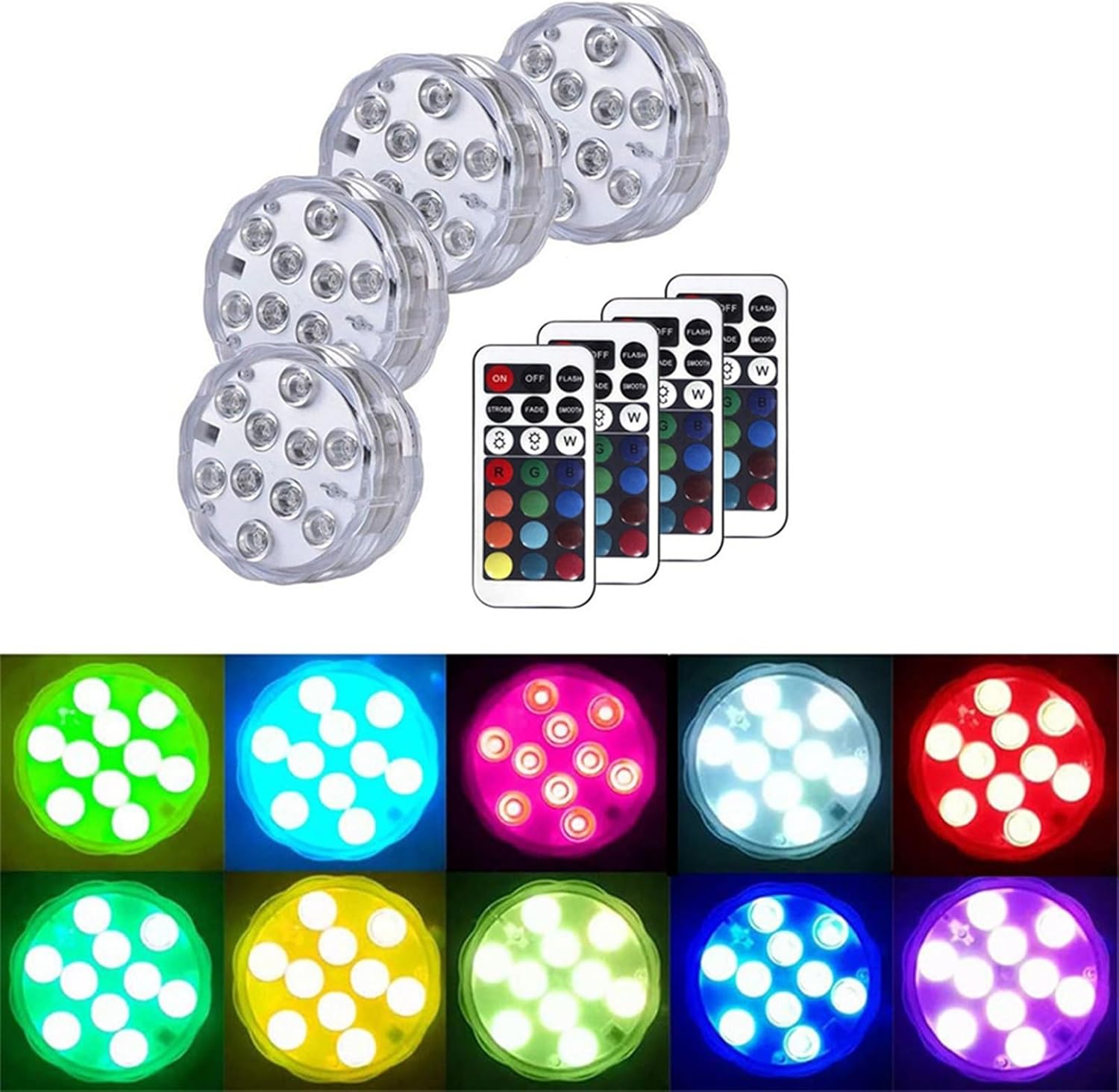 Pond LightsName:Submersible lightWattage: 2.4W per pieceLed :10 ledsLight color: RGB colorPower : 3 * AAA batteries per piece (not provided)LED quantity: 10 LED beads per pieceIngress protection: IP68Item size: 7 * 7 * 2.8cm /2.75 * 2.75 * 1.10in(L * W * H) per piecePackage:4pcs led underwater light4pcs remote controllerNote:Make sure that screw up the cap clockwise properly and tightly before throw it into water.When the battery runs out,the lights stay stuck in red,if no longer switching between colors and remote stop work,then please replace the battery.The max. depth to is recommend to be less than 2m.PicturesFeatures:Reusable:Operated by 3 x AAA batteries, Easy to replace,save money for youMulti Color:super bright 10 led built in,4 dynamic color changing modes, 16 different colors in static modes.Waterproof:The LED lights are made of double waterproof materials,Don't worries about that when submerged.Remote control: wireless design,IR remote control, dimming and ON/OFF.Multi-Purpose:Great for flower vases,pool,fish tank,wedding, party or other occasions
