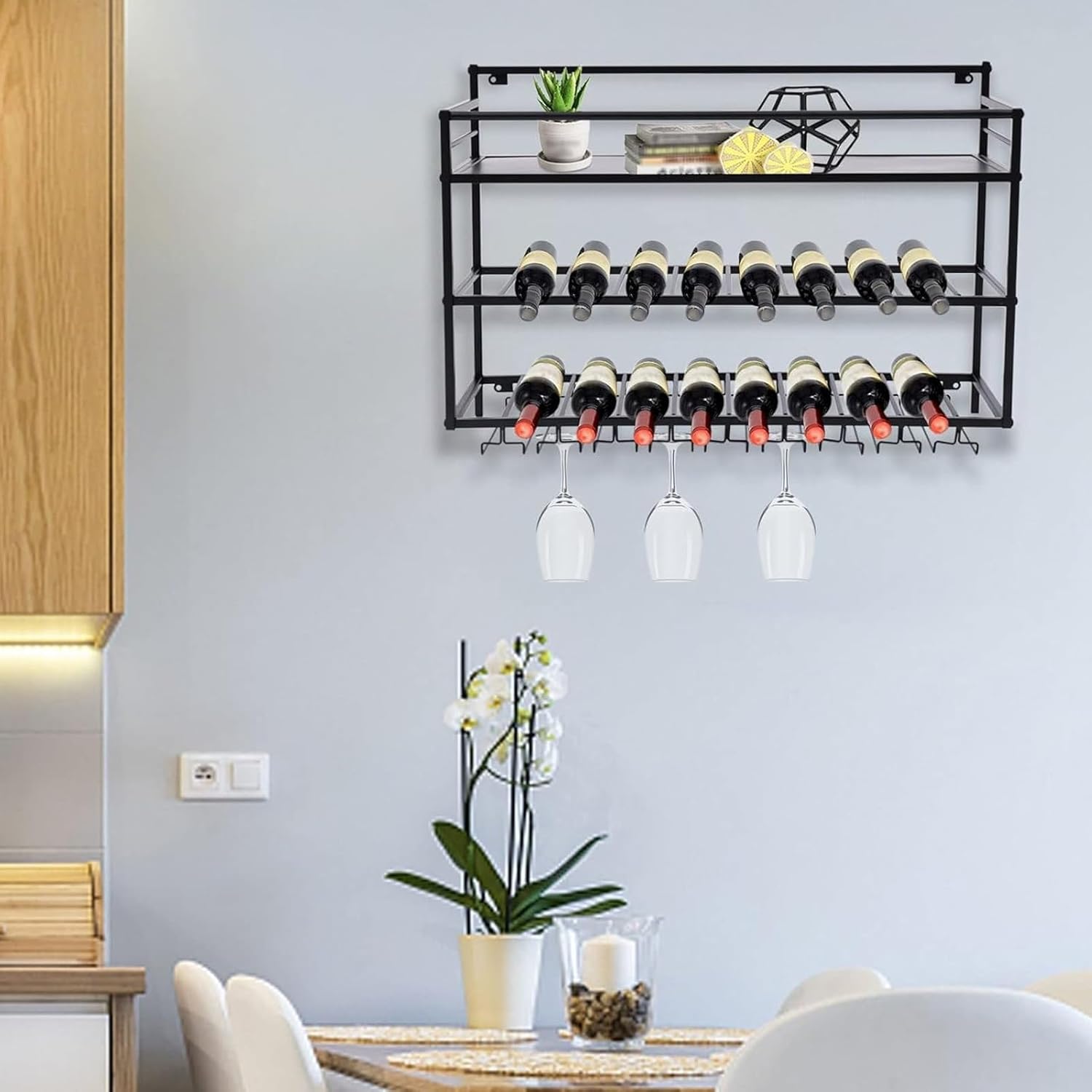 JKGHK wine bottle rack with three shelves and a row of wine glass holders, it has enough space to store wine and wine glasses. This is a wall-mounted wine shelf made of high-quality steel for wear resistance and longevity. The stylish and minimalist design allows it to blend into a variety of decoration styles. The wine stand is suitable for installation in kitchens, bars, dining rooms, living rooms, restaurants, and other places. It can also be used as a gift for wine lovers.Name: Wall mounted wine rack/Wine glass holderMaterial: IronColor: Black,GoldStyle: Minimalist modernPlacement: Wall-mountedFurniture Structure: Frame structureSurface Technology: Baking paintDimensions: 80×25×55cm/ 31.4×9.8×21.6inInstallation or not: YesUsage: Ideal for Living Room, Bedroom, Hotel, Restaurant, Bar, CafePackage Includes:- 1x wine rack- 1x screw setPlease Note:1.Only wine holder is included, other items shown are not part of the package.2.Due to lighting and monitor differences, colors may vary slightly from the images.3.Permissible measurement error: +/- 1-3cm.