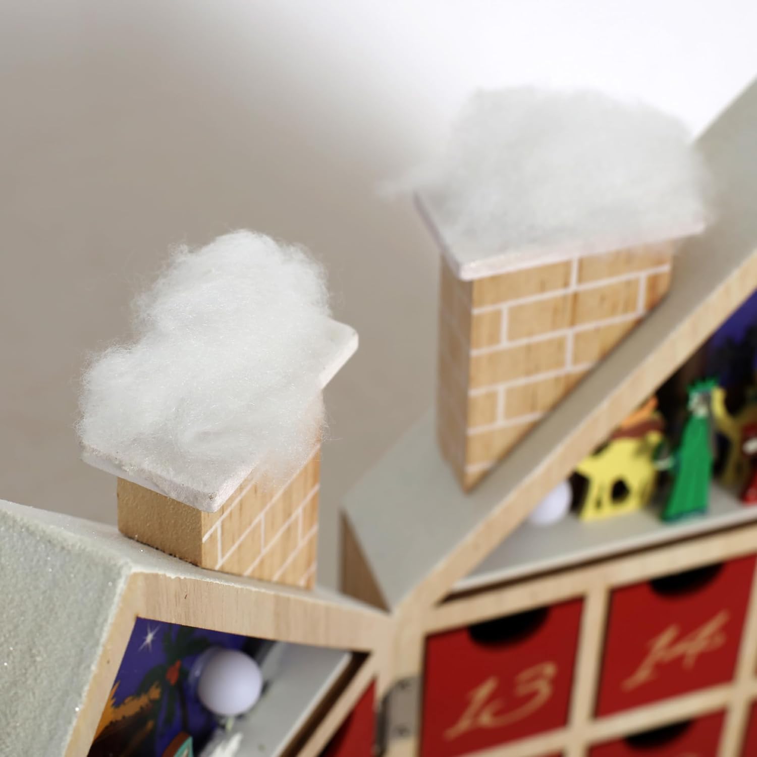 Celebrate the countdown to Christmas with this charming Wooden Nativity Advent Calendar House, complete with 24 pull-out drawers and a glowing LED nativity scene. The calendar is shaped like a cozy home with twin chimneys and snow-topped roofs, and it opens like a book to reveal two attic scenes featuring Mary, Joseph, baby Jesus, and the Wise Men. Each red drawer is numbered in gold and is perfect for storing tiny gifts or sweets. Warm white LED lights add a magical glow, powered by two AA batteries (not included). Display it on your mantel, tabletop, or church entryway, and create lasting holiday memories with this reusable and faith-filled decoration.