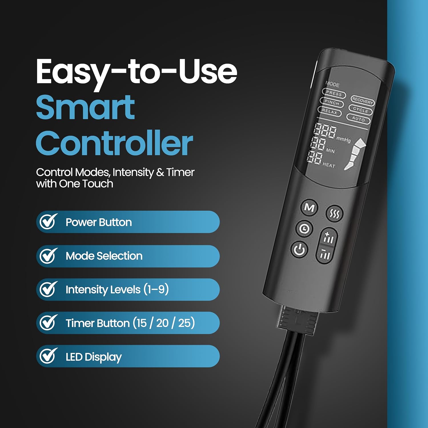 • 6 Modes & 9 Intensity Levels for Custom Recovery – This leg foot massager offers 6 modes for circulation, relaxation & post-workout recovery. Nine intensity levels (60–140 mmHg) from gentle to deep compression.