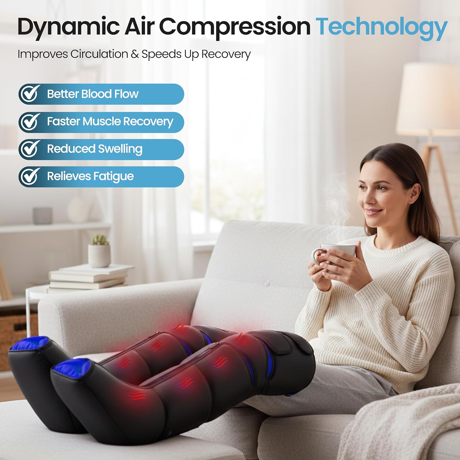 • Leg massager Circulation & Muscle Recovery – This air compression leg massager gently squeezes feet, calves & thighs, improving circulation, lymphatic drainage, reducing swelling & muscle fatigue.