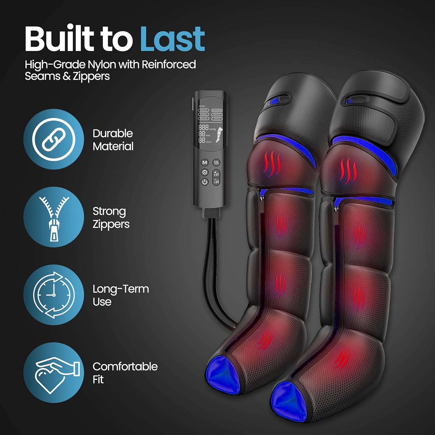 • 4 Air Chambers & Adjustable Heated Sleeves – Smart pressure sensors auto-adjust airflow to your leg shape. Zippered sleeves, Velcro wraps & tapered calf design fit most leg sizes comfortably.