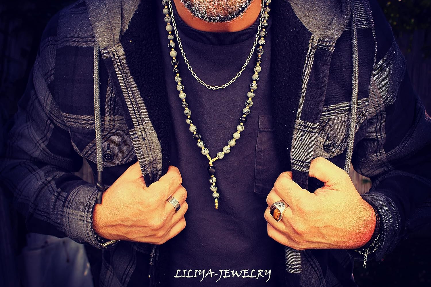 Find Your Balance with Natural StyleDiscover the Liliya Jewelry Snowflake Obsidian Y-Necklace. Crafted from natural stones, this piece combines raw energy with a sophisticated, modern design.Why Snowflake Obsidian?Natural Uniqueness: Each bead features the signature "snowflakes"—natural white inclusions against a deep black background. No two stones are exactly alike, giving you a truly one-of-a-kind piece.Shield & Protect: Known as a stone of purity, Snowflake Obsidian is used to recognize and release stressful mental patterns. It’s the ultimate stone for staying cool under pressure.Rugged Design: The Y-shape (Lariat) style is a favorite among surfers and travelers. It creates a lean, stylish line that upgrades any casual outfit instantly.Specifications: Stone: Natural Snowflake Obsidian Color: Black with White Patterns Style: Y-Necklace / Rosary / Lariat Material: High-Strength Wire & Secure Clasp Length: 26 InchesGift of Serenity A meaningful gift for the man who values both style and substance. Give the gift of balance and protection.