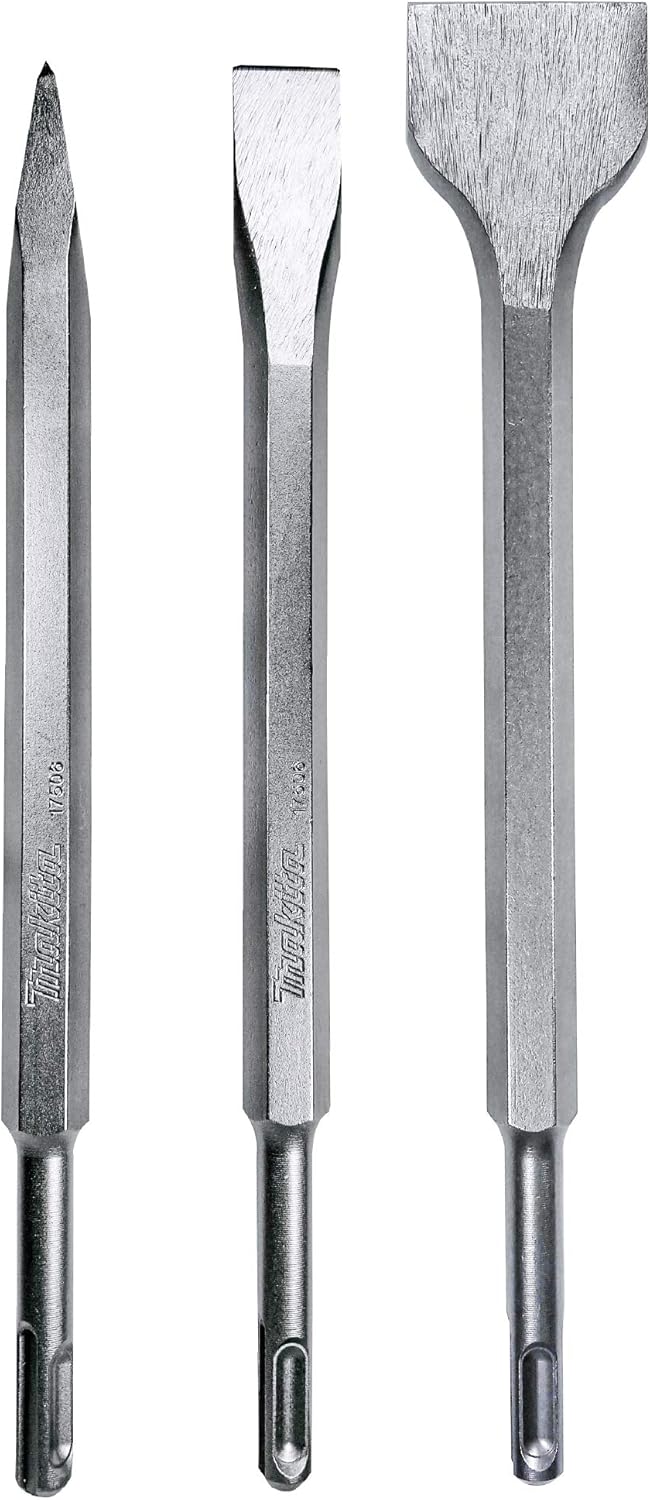 Product Description: Tackle demolition and surface prep projects with the Makita 3-Piece SDS-Plus Chisel & Point Bit Set, designed for compatibility with all SDS-Plus rotary hammers. Built from cold-forged hardened steel, this set offers excellent control and durability across a range of masonry tasks. Includes: 1 x Point Chisel: 10" - ideal for breaking and starting cracks in concrete and block1 x Flat Chisel: 10" x 0.8" - designed for splitting and edge cleanup1 x Scaling Chisel: 10" x 1.57" - perfect for removing tile, scale, and surface coatingsKey Features: Compatible with all SDS-Plus rotary hammersHardened cold-forged steel for maximum strength and lifespanOptimized for tile removal, chipping, edging, and controlled surface demolitionEngineered in Japan for consistent, reliable performanceIncludes protective sleeves to keep each bit secure and organized