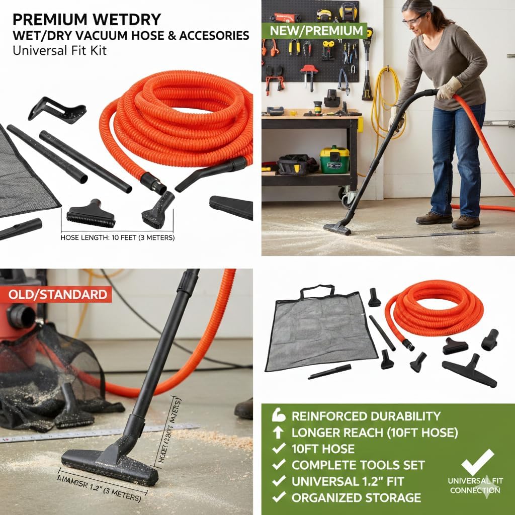 This 50 ft Premium Garage Kit is a central vacuum accessory set designed for cleaning garages, cars, workshops, RVs, and home shops using your existing central vacuum system. It includes a crush-proof, high-flexibility vacuum hose in bright safety orange along with essential cleaning tools and microfiber towels — perfect for tackling large areas without dragging your vacuum around.