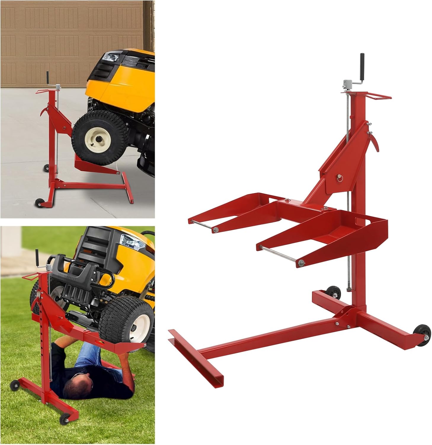 Details Bright Red Color: The bright red color serves as a warning to anyone passing by and avoid dangerous accidents. Stable Base: The I-beam bottom provides a strong and stable structure that prevents the product from tipping over during lifting and causing danger.Application The product is suitable for lifting and repairing lawnmowers, small tractors, riding lawnmowers, lawn tractors, ATVs, etc.Specifications Color: Black, Red Material: Q235 Process: Paint Spraying Mount Type: Free Standing Assembly Required: Yes Lifting Capacity: 204.12 kg / 450 lbs Product Width: 95.8 cm / 37.72 in Product Height: 115.9 cm / 45.63 in Adjustable Length: 103.8-126.3 cm / 40.87-49.72 in Package Size: 117 × 54 × 15 cm / 46.06 × 21.26 × 5.91 in Gross Weight: 27 kg / 59.52 lbs Net Weight: 25.65 kg / 56.55 lbsPackage Included 1 × Lawn Mower Lift Jack Other Needed AccessoriesNotes 1. Please check the size carefully before ordering. 2. Please note that this product does not contain lawn mowers, lawn tractors, etc.