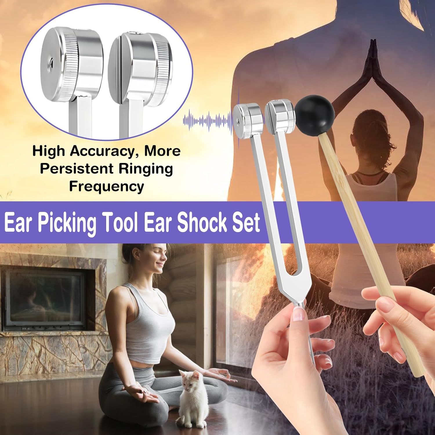 Tuning Fork Set, 3 Pieces 128 Hz 256 Hz 512 Hz Tuning Fork Hammer Set, Portable Tuning Fork with Beater, Fabric Bag, Tuning Fork Aluminium Alloy for Meditation, Yoga, Sound Therapy Weighted Functions: Tuning fork set has a clear, persistent tone that resonates in your body and helps your body, emotional and spiritual well-being Tuning fork hammer set high-quality shockproof, non-magnetic aluminium alloy produces clear, long-lasting and precise vibrations. Tuning fork set used in bones, joint muscles, nerves, body parts, resonance, stimulates the nervous system and releases nitric oxide, reduces inflammation, muscle spasms and blood circulation. Specifications: Material: aluminium. Colour: silver. Package Content: 3 x tuning fork set. 1 x mallet. 1 x fabric bag. 1 x hex key.