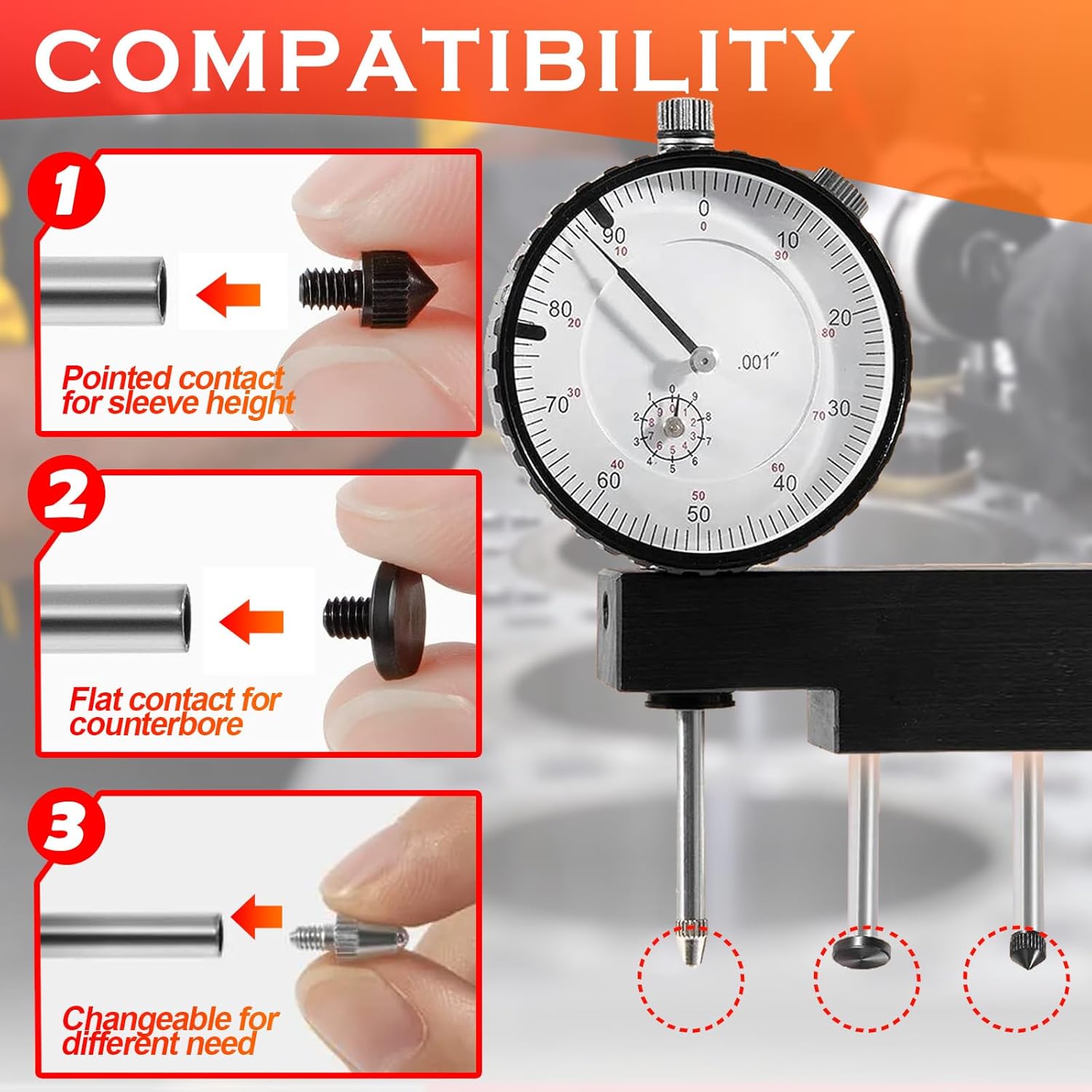 >>>WIDE COMPATIBILITY: Compatible with all diesel engines with sleeved cylinders gauge. Pointed contact for cylinder sleeve height. Flat end contact for counterbore depth. It is an essential tool for accurately measuring cylinder sleeve height, counter bore depth, top dead center, piston-to-deck height, and valve protrusion. >>>SUPERIOR MATERIAL: 6434 Sleeve Height and Counter Gauge is made of superior stainless steel frame, valve stem, spindle, and contact points. Waterproof and dustproof, high performance and long service time. >>>GREAT PERFORMANCE: The pointed contact point is designed for measuring cylinder sleeve height gauge, while the flat end contact measures counter-bore depth. Cylinder bore gauge also enables measurements of top dead center, piston-to-deck height, and valve protrusion.The rotatable bezel with clamp for easy zero set. The limit markers can be moved without interfering with the clamp. Lug back with 1/4 hole.  >>>EASY TO USE: Range: 0-1"; Graduations: 0.001". Reading: 0-100. the sleeve height gauge provides accurate readings. Includes 4374 Dial Indicator, 4375 Base, 4230 Flat Contact Point, 4378 Pointed Contact Point, Hex Wrench and Carrying Case. >>>PREMIUM SERVICE: If you encounter any problems or you're not 100% satisfied with this product, please contact us in time, we will deal with you as soon as possible.No worry about buying!
